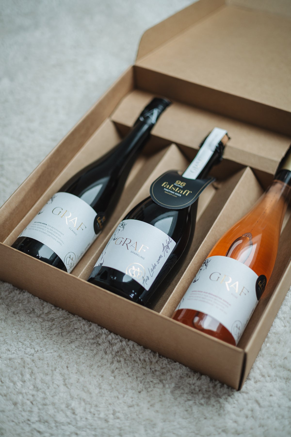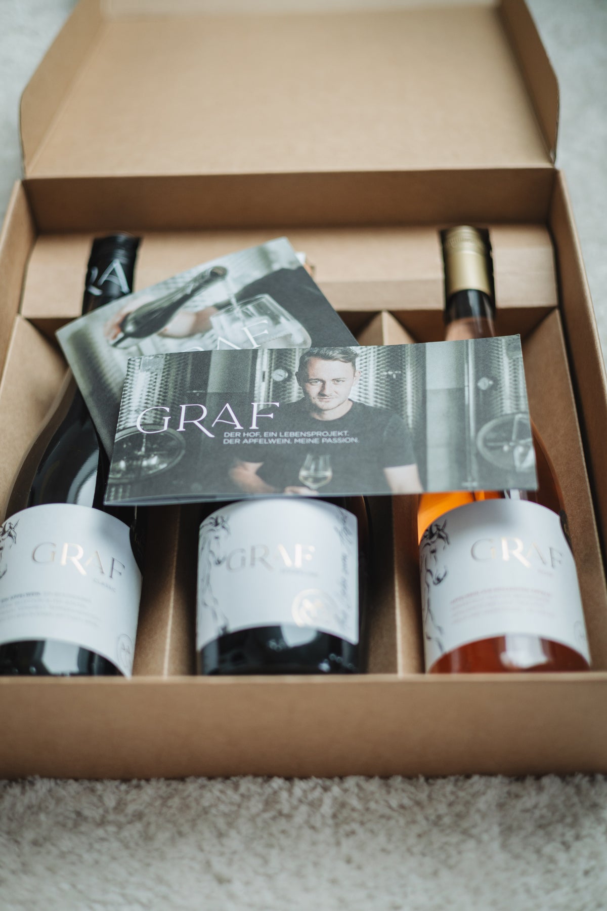 Die Apfelwein Verkostung für Zuhause. 1x GRAF Classic, 1x GRAF Rosé & 1x GRAF Sparkling im gold-geprägten GRAF-Geschenkskarton. Inkl. Verkostungsguide und Brand-Folder.